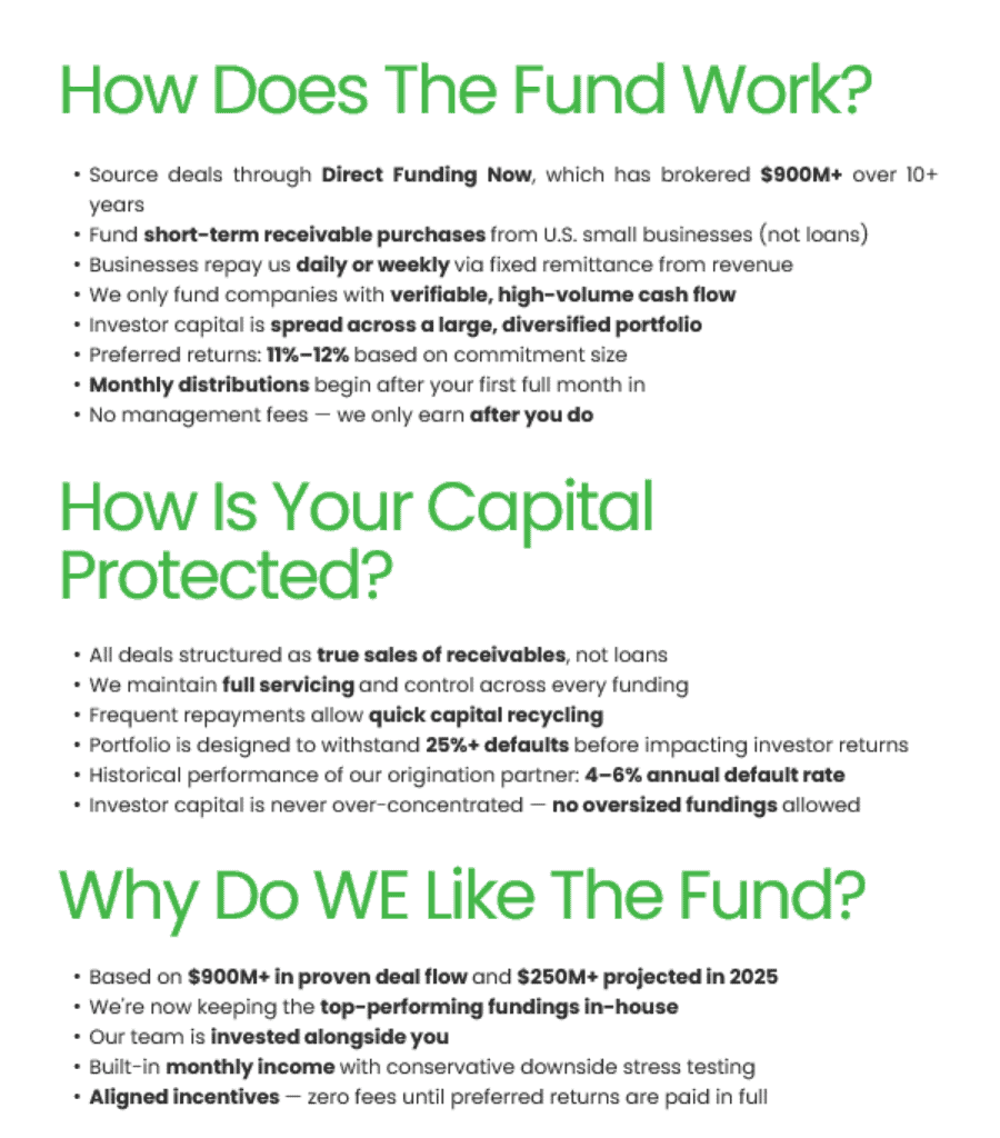 With a portfolio diversified across hundreds of receivable purchases, the fund is designed to absorb 25%+ defaults before investor returns are impacted. This type of program typically sees a 4% to 6% default rate. Investors benefit from liquidity after a 12-month lockup, followed by a 90-day redemption window, and strong preferred returns of 11%–12% paid monthly.