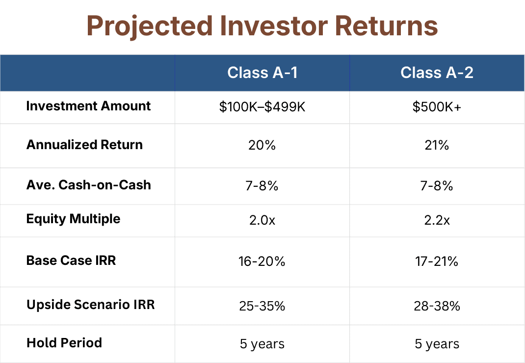 This opportunity offers investors a fixed preferred return structure with projected annual returns ranging from 13% to 15% based on investment size, projected monthly distributions beginning the first full month after funding, and a targeted three to five-year hold period.